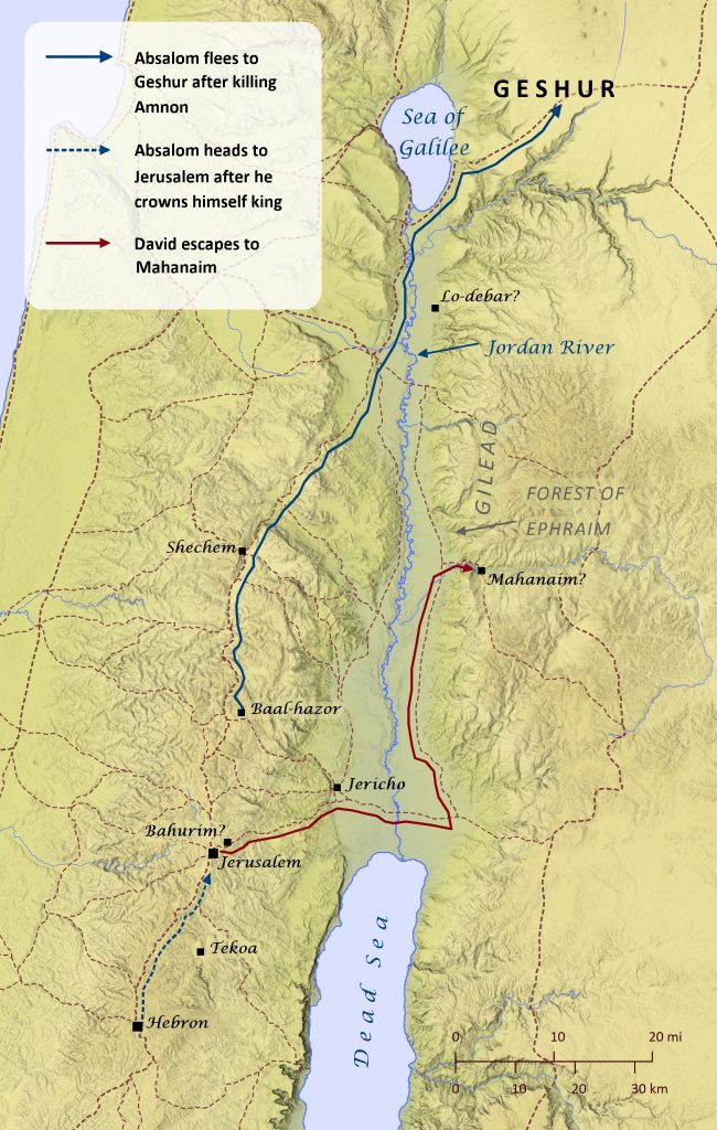 Two years after Absalom’s half-brother Amnon assaulted his sister, Absalom took revenge. He invited Amnon to attend the shearing of his sheep, and there he directed all his men to kill Amnon. Absalom fled to Geshur, where his mother’s father was king (2 Samuel 3:3). After three years David’s commander Joab arranged for a woman from Tekoa to persuade David to allow Absalom to return to Jerusalem with the assurance that he would not be harmed for killing Amnon. David agreed, but after Absalom returned he began a conspiracy against David in which he ingratiated himself to the people and orchestrated a coup. He arranged to travel to Hebron, where his followers declared him king, and he headed for Jerusalem to overthrow David. When David was informed of Absalom’s actions in Hebron, David and those loyal to him fled across the Jordan River to Mahanaim. Absalom mustered an army and traveled to Mahanaim to attack David, and they engaged David’s forces in the forest of Ephraim. David’s men thoroughly defeated Absalom’s army, and Absalom himself was killed after his mule rode under and oak tree and left him dangling in mid-air by his long hair.