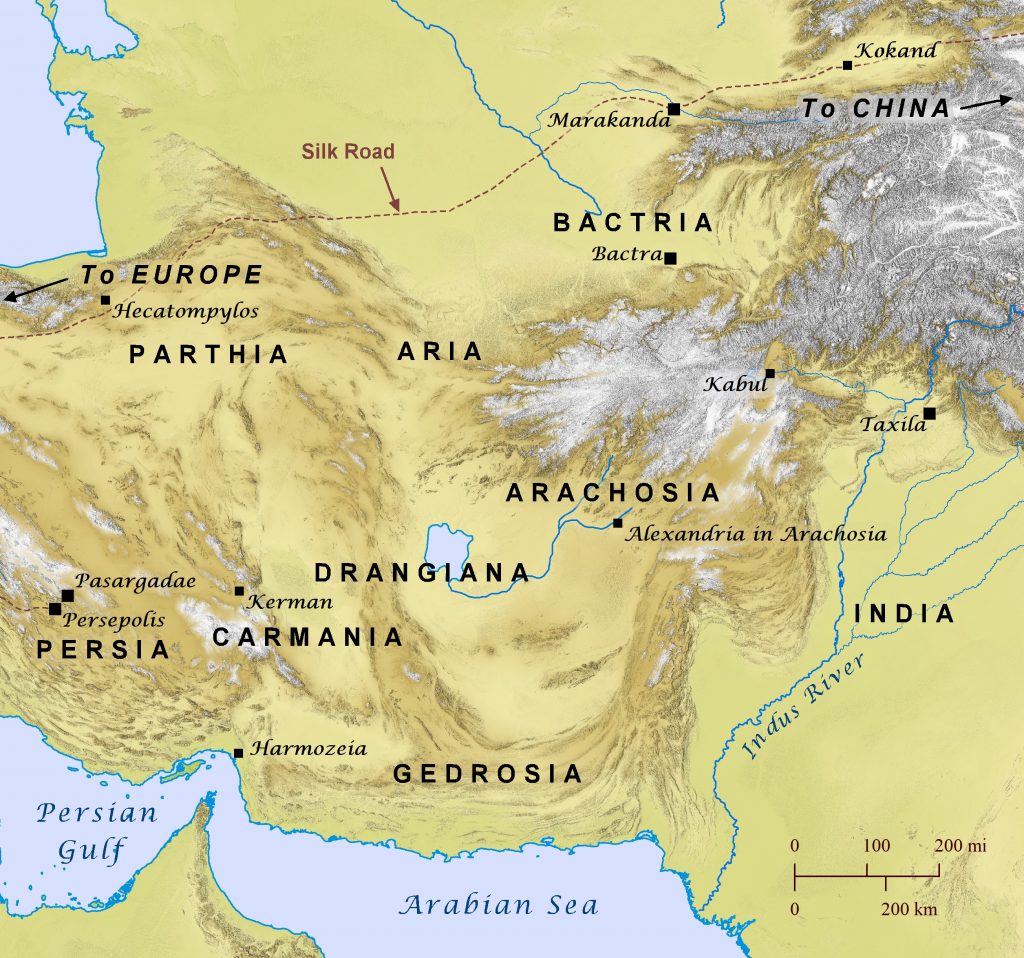 Though the lands beyond Persia are explicitly mentioned only a few times in the Bible (Esther 1:1; 8:9; Acts 2:9), these lands affected–and were affected by–biblical events in significant ways. The book of Esther notes that the domain of the Persian Empire stretched from India (its eastern border) to Cush (its western border; not shown here) during the reign of King Xerxes (around 460 B.C.). At that time the term India referred to the area surrounding the Indus River, which had given rise to a civilization that flourished many centuries earlier but that had declined significantly by Xerxes’ time. The other lands of this region (e.g., Bactria, Arachosia, and Gedrosia) were likewise very old, but the nations further west (e.g., Assyria, Babylonia, and Egypt) did not have significant involvement with them until the Persian Empire subjugated all of these lands by about 525 B.C. Alexander the Great in turn seized all of these lands from Persia, and his successors the Seleucids continued to rule them. Eventually the lands shown here came under the rule of the newly established Parthian Empire, which lasted throughout the time of the New Testament. Acts 2:9 notes that Jews from Parthia were present at the Temple in Jerusalem when Peter preached his famous sermon at Pentecost. The Silk Road, which passed through the Parthian Empire, had also become a significant trading corridor by this time, linking China and its goods with the lands of the Parthians and the Romans. There is also a very strong tradition among many Christians in modern India (located southeast of the Indus River) that the apostle Thomas eventually traveled deep into the Indian subcontinent to spread the good news of Jesus Christ.