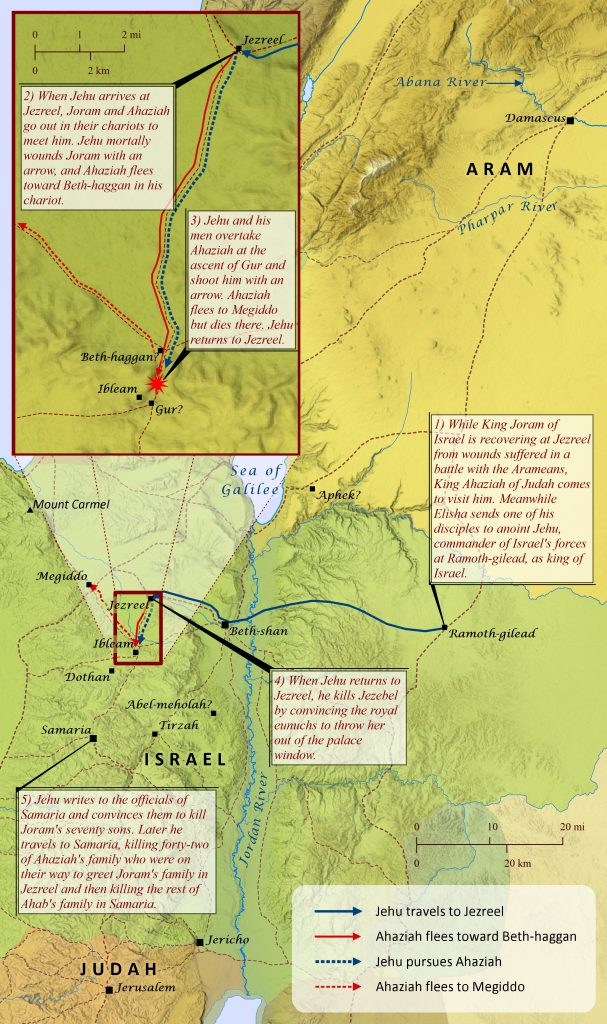 More than two centuries before the prophet Habakkuk struggled to understand how God could use the wicked Babylonians to accomplish his good purposes (Habakkuk 1), a man named Jehu rose to power over Israel and carried out deeds that were similarly God-ordained yet incredibly brutal. We first hear of Jehu while the prophet Elijah is listening for God’s voice in the cave at Horeb (1 Kings 19:16-17). There God tells Elijah to anoint Hazael as king over Aram, Jehu as king over Israel, and Elisha as the prophet to succeed him. Together these three men would carry out God’s judgment upon the wicked in Israel. Elijah then found Elisha and anointed him as prophet, and sometime later Elisha carried out the rest of God’s commands to anoint Hazael and Jehu (2 Kings 8:7-15; 2 Kings 9:6-10). This was completed as King Joram of Israel was at Jezreel recovering from wounds suffered in a battle with the Arameans at Ramoth-gilead. While he was there, King Ahaziah of Judah came to visit him, and Elisha sent one of his disciples to Ramoth-gilead to anoint Jehu, commander of Israel’s forces, as king of Israel. Jehu and his men then headed for Jezreel, and Joram and Ahaziah went out in their chariots to meet him. Jehu suddenly shot Joram with an arrow and killed him, and Ahaziah fled toward Beth-haggan in his chariot. Jehu and his men overtook Ahaziah at the ascent of Gur (likely the pass between Beth-haggan and Gur) and shot him with an arrow. At this point it appears that Ahaziah (or his chariot driver) must have reversed direction–perhaps desperately passing back through Jehu and his men–and headed for Megiddo, but Ahaziah later died there. After this Jehu returned to Jezreel and convinced the royal eunuchs to throw Jezebel out of the palace window to her death. Jehu then wrote to the officials of Samaria, warning them that they must prove their loyalty to him by sending him the heads of Joram’s seventy sons. Fearing Jehu’s power, the officials complied. Later Jehu traveled to Samaria, and along the way he met forty-two of Ahaziah’s family who were on their way to greet Joram’s family in Jezreel. Jehu and his men slaughtered all forty-two relatives at Beth-eked of the Shepherds, an uncertain location that must have been located somewhere along the road from Samaria to Beth-haggan. After Jehu arrived in Samaria, he and his men killed the rest of Ahab’s family. Later they slaughtered many prophets of Baal as well.