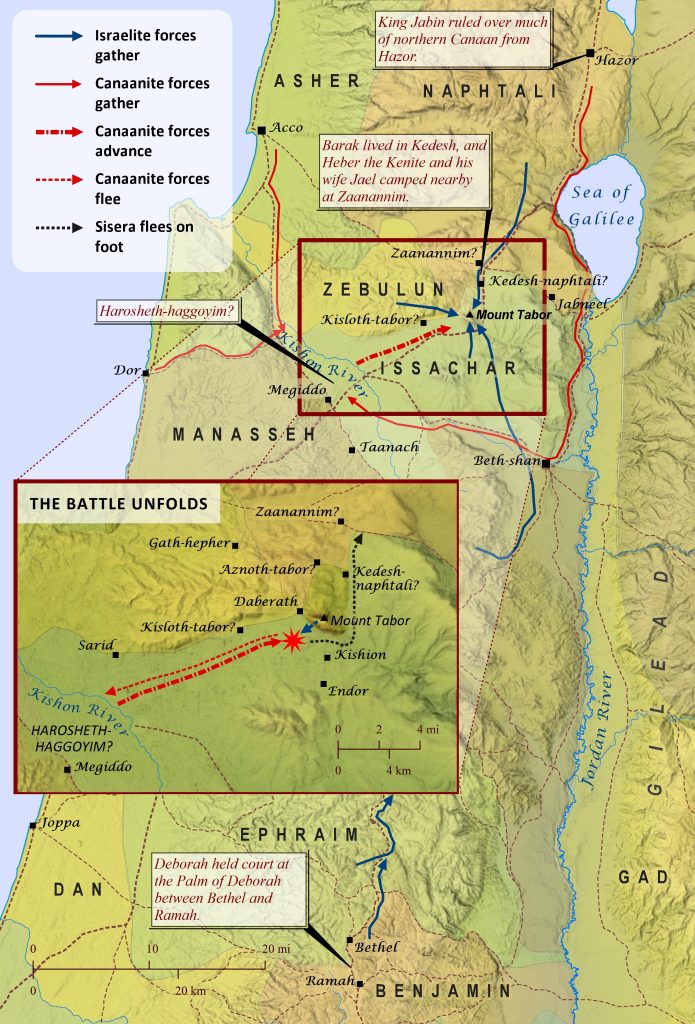 The story of the victory of Deborah and Barak over Jabin and Sisera is well known, and the location of the battle is clear. Less clear, however, are the locations of other places mentioned in the story, but the context of the story and Joshua’s descriptions of Israel’s tribal boundaries (Joshua 19) enable some possible identifications to be made. The story takes place in the time of the Judges, and a judge named Deborah was holding court in the territory of Benjamin. Meanwhile a man named Jabin was ruling over the Canaanites in the north, and his capital was located at Hazor, which must have been reinhabited after the Israelites had completely destroyed it during the conquest of Canaan (Joshua 11). Jabin’s commander Sisera was located in Harosheth-haggoyim (possibly meaning “farmland of the Gentiles”), a location that is not certain, but the context of the story suggests it refers to the plain near Megiddo and the Kishon River. Deborah called upon a man named Barak to lead an army of Israelites up Mount Tabor to draw Sisera to attack with his forces. Barak was from Kedesh-naphtali, a town that is noted as being close to Zaanannim. At some point a Kenite named Heber and his wife Jael had also set up their camp at the Oak at Zaanannim, which must have been located a little west of Jabneel (Joshua 19:33). The location of Jabneel is well established, leading some scholars locate Zaanannim a little further west near modern ash-Shagara, which is also called Ilanya and likely preserves the word Elon (“oak”). Regarding Kedesh-naphtali, this author has recently discovered that Khirbet Kashtah would make a good candidate (shown on this map), since it satisfies the requirements of Joshua 19:33 and Judges 4 very well. Ash-Shagara and Khirbet Kashtah are both appropriately located within territory that belonged to Naphtali, and they sit along two key routes just north of Mount Tabor, where Israel’s troops were gathered. So it is fitting that Sisera would have passed by these locations as he fled the battle on foot, perhaps on his way to King Jabin in Hazor. Finally, it is not difficult to see how the name Kedesh could have evolved into Kashtah over time. Returning to the story, we read that Sisera and his vast army of chariots advanced to Mount Tabor, and the Israelites charged quickly down the mountain to counter-attack. The Israelites routed the Canaanites and pursued them all the way back to Harosheth-haggoyim. Deborah’s song commemorating the victory suggests that a sudden downpour also swelled the Kishon River, causing the chariots to become stuck in the mud (Judges 5:4-21). The story concludes by recounting how Sisera himself met his demise at the hands of Jael while he was fleeing on foot. After this, Jabin’s strength was broken, and the Israelites continued to press against him until he was destroyed.