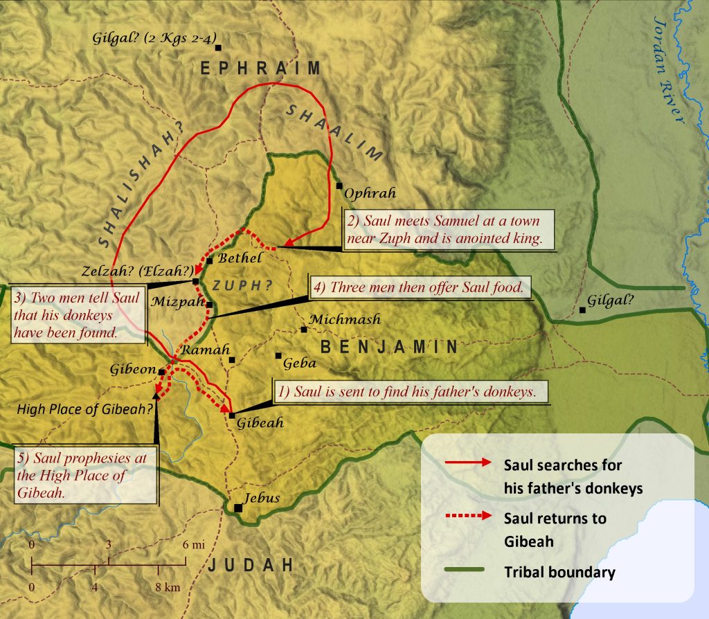 Despite the generous supply of geographical references surrounding the story of Saul searching for his father’s donkeys, the narrative has led to much confusion regarding exactly where Saul went. Most of the locations mentioned in the story, including Shalishah, Shaalim, Zuph, Zelzah, and Gibeah-elohim, have had multiple suggestions offered as the places intended. A careful study of the context of the story and other passages of Scripture, however, offers some helpful clues regarding what was likely the path taken by Saul. The story, which demonstrates God’s selection of Saul as king, opens with Saul’s father Kish sending Saul from their home in Gibeah to look for some lost donkeys. The first place Saul passes through is the hill country of Ephraim, suggesting that he headed northwest, since heading northeast would have required him to pass through a significant portion of Benjamin first, but this is not mentioned. It also notes that he passed through Shalishah, which must have been near the Gilgal of Elisha’s time (see 2 Kings 4:42 and the surrounding passage). Then Saul passes through Shaalim (meaning “foxes”), which must be identical with the land of Shual (meaning “fox”) near Ophrah (1 Samuel 13:17). Then he reaches the area of Zuph, which may have been near Bethel and Ramah, and Samuel is visiting a town nearby. Saul meets Samuel there, and Samuel anoints Saul to be Israel’s king. To confirm to Saul that he is indeed chosen by God to be Israel’s king, Samuel tells Saul that he will encounter two men near Rachel’s tomb at Zelzah on the border of Benjamin, and they will tell him that Saul’s donkeys have been found. This author has identified Khirbet al-‘Ashi as a good candidate for Zelzah. This site is appropriately located along the border of Benjamin, and it is likely the same location as the town of Elasa in 1 Maccabees 9:5. This author has concluded that the initial tsadee (“Z”) is likely a corruption of an original ayin (which is very similarly shaped), and this letter is often omitted when transliterated to Greek. This is also supported by the complete absence of the word Zelzah in the Septuagint. The actual name of the town, then, may have been Elzah or Elezah. Then near the great tree at Tabor (an uncertain location) Saul will encounter three men on their way to Bethel who will offer him food. After this Saul will go to Gibeah-elohim, which is probably best understood as the High Place of Gibeah at an-Nebi Samwil, shown here, and not as the Gibeah where Saul lived, because later it is noted that the Philistines had an outpost at Gibeah-elohim (1 Samuel 10:5), and this would almost certainly not have been Saul’s hometown. Samuel then says that at Gibeah-elohim Saul will be enabled by the Spirit of God to prophesy. Then Saul is to go “down” to Gilgal (likely the one near the Jordan River) and wait for Samuel there. Saul then leaves Samuel, and all these things happen just as Samuel has foretold. After Saul prophesies at the High Place of Gibeah, Samuel assembles all the Israelites at Mizpah, and there they select the new king by lot, which singles out Saul as the new king. Then Saul returns to his home in Gibeah.