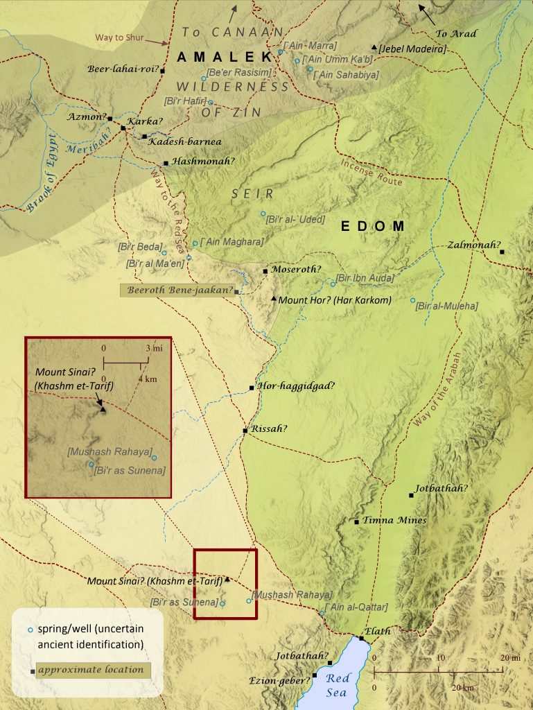 After the Israelites received the law on Mount Sinai, which may have been located at Khashm et-Tarif (see also “The Route of the Exodus”), they traveled to Kadesh-barnea, a distance that took eleven days “by the way of Mount Seir” (Deuteronomy 1:2). The phrase “by the way of Mount Seir” suggests that more than one route existed between Mount Sinai and Kadesh, as shown here, but the road the Israelites took probably ran alongside the mountainous region of Seir. This route would have offered greater access to water from wells, natural springs, and seasonal streams flowing from the hills of Seir–a critical necessity for a large group traveling through this very arid region. Nearly every location identified on this map was essentially a small community centered around one of these life-enabling sources of water. After reaching Kadesh in the wilderness of Zin, the Israelites prepared to enter Canaan by sending spies to scout out the land. But when ten of the twelve spies brought back news about the strength of the Canaanites, the people became afraid to enter the land, so the Lord punished them by condemning them to travel in the wilderness for forty years until that generation died off. Some Israelites repented and tried to enter the land, but they were beaten back to Hormah by the Amalekites and Canaanites. So for forty years the Israelites traveled from place to place, probably in the general area of Kadesh-barnea, though very few locations mentioned are able to be established with much certainty. As the forty years of traveling drew to a close, the Israelites prepared again to travel to Canaan by requesting permission from the king of Edom to pass through his land. When the king refused, the Israelites “turned away” from the Edomites and set out from Kadesh to travel to Mount Hor. The Jewish historian Josephus located Mount Hor at Jebel Nebi Harun, a very tall mountain in eastern Edom, but this has been rejected by many scholars in favor of other sites such as Jebel Madeira to the northeast of Kadesh. This author is convinced, however, that any candidate for Mount Hor must be sought to the south of Kadesh-barnea. Numbers 33:30 and Deuteronomy 10:6 mention that, during their wilderness travels, the Israelites camped at Moseroth/Moserah, which was apparently located at Mount Hor, since both Moseroth/Moserah and Mount Hor are cited as the place where Aaron died (Numbers 21:29-29; 33:37-39; Deuteronomy 10:6-9). It is difficult to envision the Israelites traveling back to the edge of Canaan after suffering defeat there the last time they attempted to enter the land. These same passages also note that after their stay at Moseroth/Moserah the Israelites traveled to Hor-haggidgad/Gudgodah (probably located along the Wadi Khadakhid) and then to Jotbathah, with no mention of passing through Kadesh, which they would have had to do if Mount Hor was north of Kadesh (since they were avoiding the land of Edom). Also, in Deuteronomy 2:1 Moses says that after the Israelites left Kadesh, “we journeyed back into the wilderness, in the direction of the Red Sea, as the Lord had told me and skirted Mount Seir for many days,” and Aaron’s death on Mount Hor fits best during this time. Similarly, Numbers 21:4 says “from Mount Hor they set out by the way to the Red Sea, to go around the land of Edom,” but there would have been no way to the Red Sea around the land of Edom if Mount Hor were located northeast of Kadesh. One element of the wilderness narratives that appears to favor a northeast location for Mount Hor, however, is the story of the king of Arad, which the book of Numbers (chapters 21 and 33) places immediately after the death of Aaron on Mount Hor. At first glance, the narrative seems to imply that the king attacked the Israelites at Mount Hor, which fits better with a northern location. Yet, it is also possible that the story is simply noting that it was after the Israelites’ arrival at Mount Hor that the king of Arad first learned of the Israelites’ renewed intentions to enter Canaan, perhaps as a result of their request to pass through Edom. But it may have been later that the king of Arad actually engaged them in battle, perhaps as they were passing north of Zalmonah and appeared to be ready to enter Canaan by way of Arad (see Numbers 33:41-42 and the map “The Journey to Abel-shittim”). For these reasons, this author believes that Har Karkom is the best candidate for the location of Mount Hor. The site is appropriately located at the edge of Seir and along the way to the Red Sea. This site’s role as an ancient cultic center is also well established. Perhaps Aaron’s priestly duties and authority in Israel had grown out of a similar role he had previously held at Mount Hor (see also Numbers 12:1-2; Deuteronomy 33:2; Judges 5:4-5), where he was eventually buried.