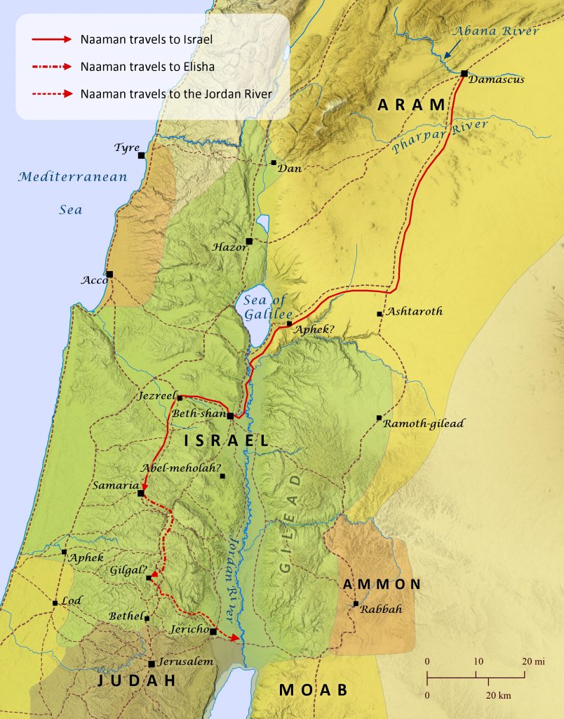 Though it is difficult to discern exactly when the various stories of Elijah and Elisha took place, all of them occurred during an era of Aramean strength, roughly spanning the ninth century B.C. In this story, a man named Naaman, commander over the Aramean army, suffered from leprosy, and a captive Israelite girl in his household told him that a prophet in Samaria could cure him. Naaman received permission from the king of Aram to travel to Samaria, and the king sent a letter with Naaman, confirming that Naaman had come to be healed of his leprosy. Naaman arrived in Samaria and gave the letter to the king of Israel, but the king tore his clothes in anguish, because he believed this was impossible, and then the Arameans would attack him for his failure to cure Naaman. But Elisha heard about this and told the king to send Naaman to him. It is not clear whether Elisha was living in the city of Samaria at this time or in another place in the greater vicinity of Samaria such as Gilgal, where Elijah and Elisha appear to have led a school of prophets (2 Kings 2:1-2; 4:38). When Naaman arrived at Elisha’s house, Elisha simply sent a messenger to the door with instructions for Naaman to go and wash in the Jordan River seven times. Naaman was initially incensed that Elisha did not come himself and instantly cure the leprosy, and he boasted that the rivers of Abana and Pharpar near Damascus were better than any of the rivers of Israel. He started to leave in anger, but his servants convinced him just to try this simple task. So Naaman went down to the Jordan River, perhaps near Jericho, and when he washed in the water he emerged with his skin free of leprosy. He returned to Elisha and declared that there is no god except the God of Israel. Naaman then offered Elisha a gift, but Elisha refused to accept it, so Naaman requested instead that he be allowed to take back two mule-loads of dirt to Aram so that he could offer sacrifices to the Lord. Naaman may have made this request because, in his pagan understanding of God, he may have believed that each god was tied to a particular land or nation, so he needed to be on Israelite soil to offer an acceptable sacrifice to the God of Israel. It appears that Elisha granted Naaman’s request and sent him on his way.