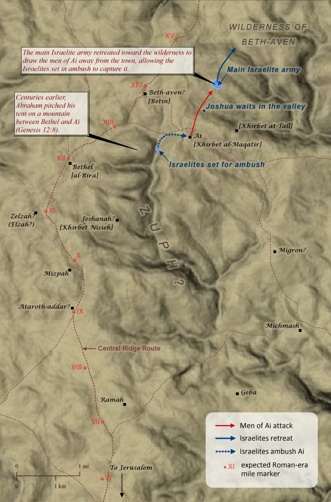 Soon after the Israelites entered the Promised Land and captured the city of Jericho, they sent a force of only three thousand men to capture the much smaller fortified town of Ai (Joshua 7). They suffered defeat, however, and the Lord revealed to them that this happened because a man named Achan had taken some of the devoted items from Jericho. So Joshua took Achan and his family to the Valley of Achor and executed them there (see Israel Enters the Promised Land map). Later the Lord told Joshua to attack Ai again, because this time he was going to give them the town. It appears that Ai, which had a direct line of sight to the more powerful city of Jerusalem to the south, must have served as a sort of early warning outpost for the larger city. Thus, capturing Ai was critical to staging an effective battle campaign throughout southern Canaan. So Joshua advanced with thirty thousand troops during the night and camped north of the city, and he positioned a force of five thousand men in ambush between Bethel and Ai, just to the west of Ai. The men in ambush were also just east of the mountain where Abraham had pitched his tent centuries earlier (Genesis 12:8). Joshua himself spent the night in the valley between Ai and the main Israelite camp. Early the next morning, the king of Ai led all the inhabitants of the town in an attack on the main camp of the Israelites, who feigned retreat into the wilderness. After the Israelite army had drawn the people of Ai away from the town, the Israelites hiding in ambush rose up and captured Ai. They set the town on fire, sending a signal to the the main army of Israelites to turn back upon the forces of Ai. The Israelites completely destroyed the people of Ai and reduced the town to a burning heap of ruins.