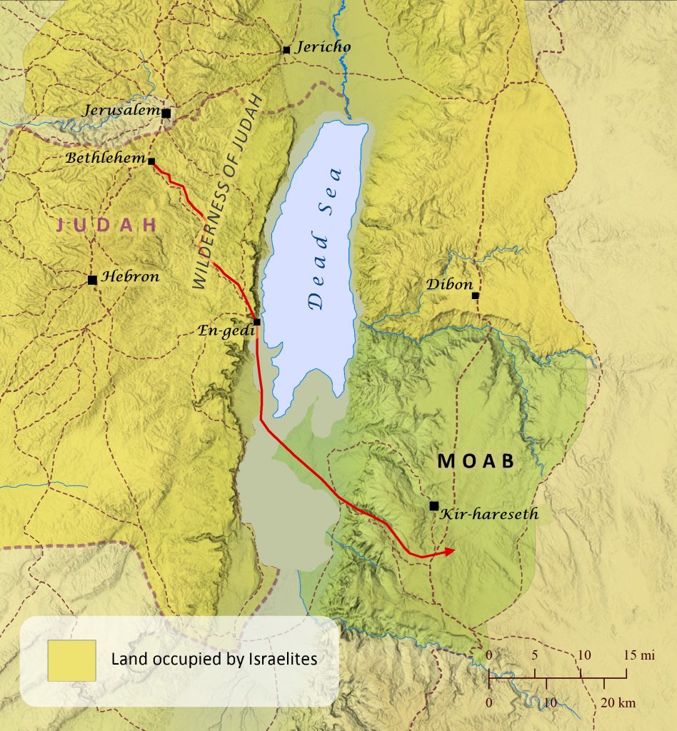 The story of Ruth is set in the time of the Judges, a few generations before the birth of King David. While much animosity often existed between Israel and Moab (Judges 3:12-30; 10:6-12:7; 2 Samuel 8:2; 10; 2 Kings 3:4-27; 2 Chronicles 20; see also Nations across the Jordan River map), other times the two nations appear to have enjoyed a somewhat congenial relationship, as is demonstrated by Naomi’s willingness to relocate to Moab to seek relief from a famine. Later Naomi’s sons also marry Moabite women, and Ruth’s devotion to Naomi and her God no doubt speaks highly of the character of many Moabites. Many years later Ruth’s great-grandson David placed his parents in the care of the king of Moab while he was on the run from King Saul (1 Samuel 22:3-4).