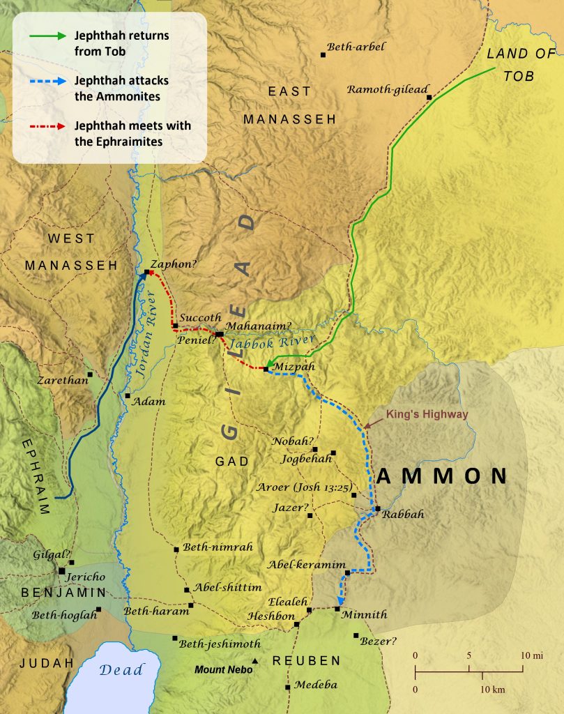 The story of Jephthah is set in the time of the judges, when Israel was settling into the land they had taken possession of many years early under Joshua’s leadership. Continuing their repeated pattern of sin, oppression, repentance, and deliverance, the people of Israel were suffering attacks by the Ammonites, who normally occupied the eastern edge of habitable land east of the Jordan River. The region of Gilead and the tribes of Judah, Benjamin, and Ephraim were the primary targets of these attacks (Judges 10:6-10), and the Israelites cried out to the Lord for help. Jephthah had been born to a prostitute in Gilead and was driven away to the land of Tob by his brothers, but the elders of Gilead sent for him to come and lead them to fight against the Ammonites. When Jephthah returned, he sent a message to the king of Ammon asking him why he was attacking Israel. The king of Ammon answered that the land east of the Jordan River taken under Joshua’s leadership actually belonged to the Ammonites, but Jephthah replied that this land had not belonged to Ammon but to Sihon king of the Amorites. Apparently Sihon had captured this land from the Ammonites as well as the northern half of Moab from the Moabites (Numbers 21:26; Joshua 13:25). He then attacked the Israelites while they were approaching the plains of Moab, and the Israelites defeated him, taking all his land. The king of Ammon ignored Jephthah’s response, so Jephthah attacked the Ammonites and defeated them, devastating twenty of their towns in the process. During the battle, Jephthah made a tragic vow to sacrifice whatever came out of his house to greet him upon his victorious return. When the Ephraimites heard of Jephthah’s war with Ammon, they were angry him and met with him at Zaphon to ask why he never asked them to join him in battle. Jephthah insisted that he had invited them, but they did not come. Then Jephthah’s men fought against the Ephraimites and defeated them, capturing the fords of the Jordan River (shallow crossing points) and killing any Ephraimites who tried to cross back over to Ephraim. Apparently the Gileadites could identify these Ephraimites by their inability to pronounce the sound sh, which the Gileadites could pronounce.