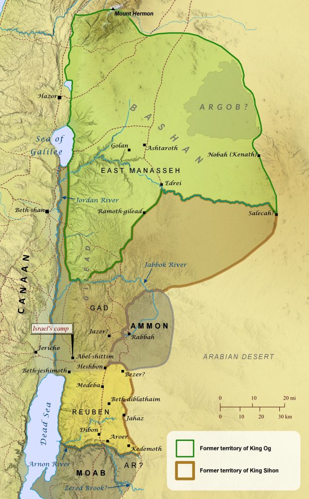 As the Israelites approached Canaan from the east, they asked the Amorite king Sihon if they could pass through his land, but he attacked them instead. The Israelites defeated him at Jahaz and captured all his land (Deuteronomy 2:24-37). After this they turned northward toward Bashan and defeated King Og at Edrei (Deuteronomy 3:1-11). Though the lands of Sihon and Og were not part of Canaan (which lay west of the Jordan River; see Numbers 34), the tribes of Reuben, Gad, and Manasseh requested that this land be allotted to them as their inheritance, and Moses agreed. The eastern tribes promised to continue helping the other tribes drive out the Canaanites from land west of the Jordan River (Numbers 32; Deuteronomy 3:12-20).