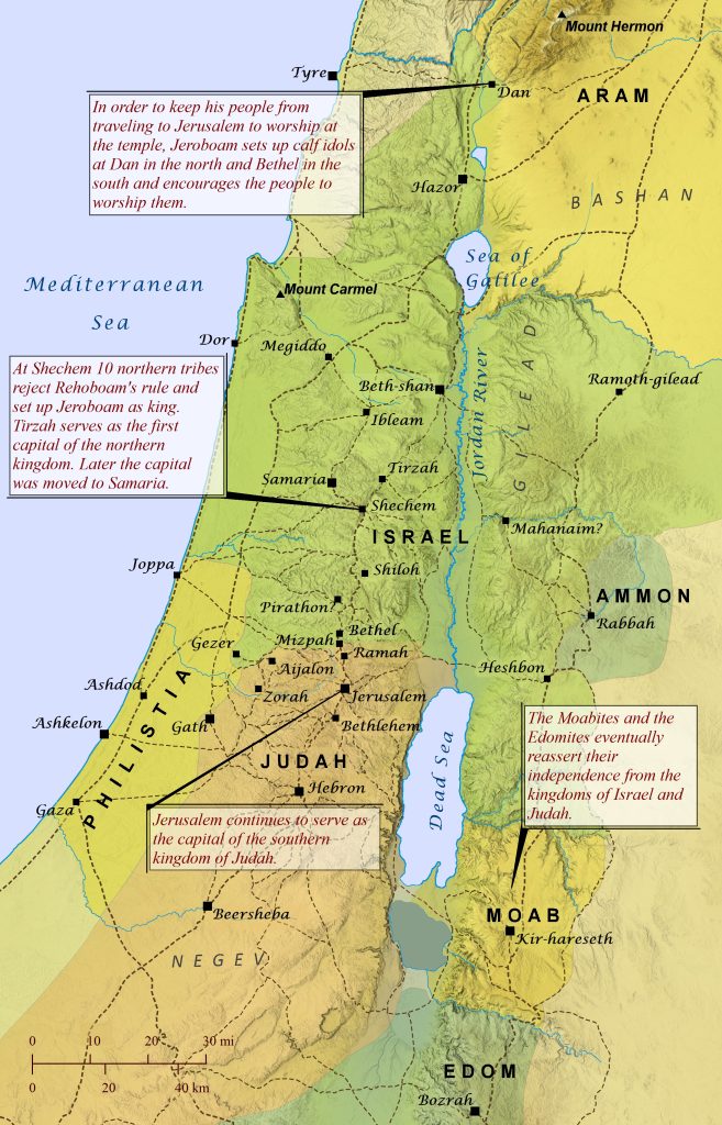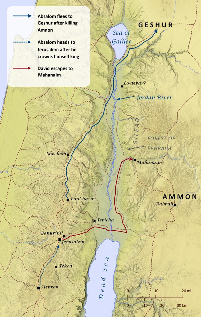 1) After David defeated Goliath and came to serve Saul at the royal court in Gibeah, he continued to demonstrate himself as an able commander and grew in favor with the people, and he developed a deep friendship with Saul’s son Jonathan. At the same time, however, Saul grew jealous of David’s success and eventually sought to kill him (1 Samuel 16-18), 2) so David fled to the prophet Samuel at Ramah (1 Samuel 19). 3) Later David returned to Gibeah, and Jonathan warned him that Saul was determined to kill him (1 Samuel 20), 4) so David fled to the priestly town of Nob. There the priest Ahimelech gave him food and the sword of Goliath (1 Samuel 21:1-9). 5) David then sought asylum in Gath and pretended to be insane to avoid suspicion from the king of Gath (1 Samuel 21:10-15). 6) David later left Gath and lived in a cave at Adullam. There many family members and discontented people joined his small army (1 Samuel 22:1-2). 7) Then David took his parents to Moab, where he placed them in the care of the king of Moab (1 Samuel 22:3-4). 8) After this David stayed for a while in The Stronghold, which may have been the fortress of Masada (1 Samuel 22:4), 9) and then the Lord told him to go to the Forest of Hereth, and the priest Abiathar eventually joined him there (1 Samuel 22 4:5). 10) Then the Lord told David to rescue the town of Keilah, and David stayed in the town after this (1 Samuel 23:1-12). 11) Later David stayed in various strongholds in the Wilderness of Ziph (1 Samuel 23:13-23). 12) While he was in the Wilderness of Maon, David narrowly escaped capture by Saul (1 Samuel 23:24-28; see also 1 Samuel 26:1-4), 13) and soon after this he moved to the strongholds of En-gedi, where he spared Saul’s life (1 Samuel 23:29-24:22; see also 1 Samuel 26:5-25). 14) David went back to The Stronghold (1 Samuel 24:23) 15) and then to the Wilderness of Maon, where he married a woman named Abigail after her husband died (1 Samuel 25:1-44). Eventually David returned to Gath (1 Samuel 27).