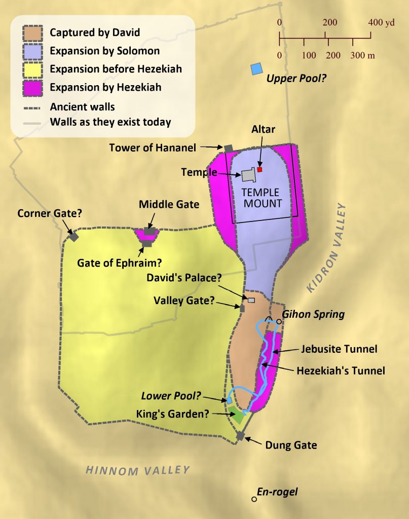 The city of Jerusalem underwent many changes throughout Bible times. When King David captured the city from the Jebusites (2 Samuel 5:6-10; 1 Chronicles 11:4-9), it was a relatively small fortress positioned next to the Gihon Spring–-a dependable source of water that later enabled the city to withstand various sieges (2 Kings 18:13-19:37; 2 Chronicles 32; Isaiah 36-37). King Solomon built the Temple of the Lord on a threshing floor north of the city (2 Samuel 24; 1 Chronicles 21), and the city continued to grow. King Hezekiah eventually expanded the walls to encompass a much larger area and replaced the old Jebusite tunnel with another tunnel (probably called Shiloah) to channel water more securely from the Gihon Spring to the Lower Pool (later called the Pool of Siloam/Shiloah) and the king’s garden. This new tunnel is probably what Isaiah 8:5-8 refers to when it rebukes the people of Judah for rejecting the gently flowing waters of Shiloah to support the Arameans. Many years later in 586 B.C. the Babylonians attacked the city, destroyed the city and the Temple, and sent many Judeans into exile (2 Kings 25:1-21; 2 Chronicles 36:17-21; Jeremiah 39:1-10; 52:1-30).