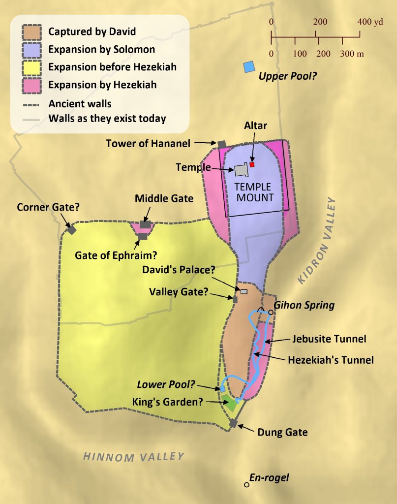 The city of Jerusalem underwent many changes throughout Bible times. When King David captured the city from the Jebusites (2 Samuel 5:6-10; 1 Chronicles 11:4-9), it was a relatively small fortress positioned next to the Gihon Spring–-a dependable source of water that later enabled the city to withstand various sieges (2 Kings 18:13-19:37; 2 Chronicles 32; Isaiah 36-37). King Solomon built the Temple of the Lord on a threshing floor north of the city (2 Samuel 24; 1 Chronicles 21), and the city continued to grow. King Hezekiah eventually expanded the walls to encompass a much larger area and replaced the old Jebusite tunnel with another tunnel (probably called Shiloah) to channel water more securely from the Gihon Spring to the Lower Pool (later called the Pool of Siloam/Shiloah) and the king’s garden. This new tunnel is probably what Isaiah 8:5-8 refers to when it rebukes the people of Judah for rejecting the gently flowing waters of Shiloah to support the Arameans. Many years later in 586 B.C. the Babylonians attacked the city, destroyed the city and the Temple, and sent many Judeans into exile (2 Kings 25:1-21; 2 Chronicles 36:17-21; Jeremiah 39:1-10; 52:1-30).